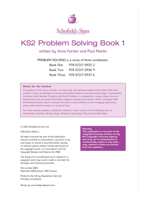Key Stage 2 Problem Solving is a series of graded activity books helping children to sharpen their mathematical skills. It encourages them to apply their maths skills to a range of 'real-life' situations, such as shopping and keeping score in games.