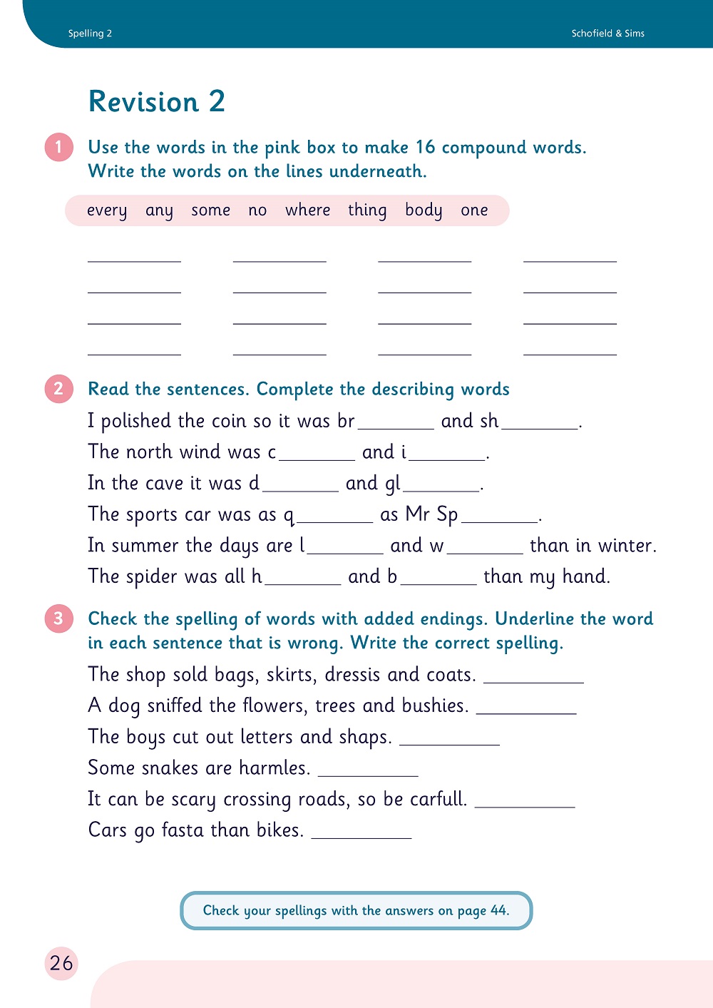Schofield & Sims Spelling is a structured and rigorous programme designed for Key Stages 1 and 2 and also suitable for some older students. Comprising six pupil books and an accompanying teacher’s guide and teacher’s resource book, this comprehensive series builds on pupils’ phonics knowledge while also helping them to understand how word structure and meaning can help them to spell words. Each Spelling pupil book:
