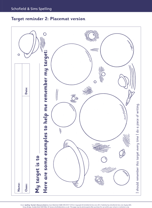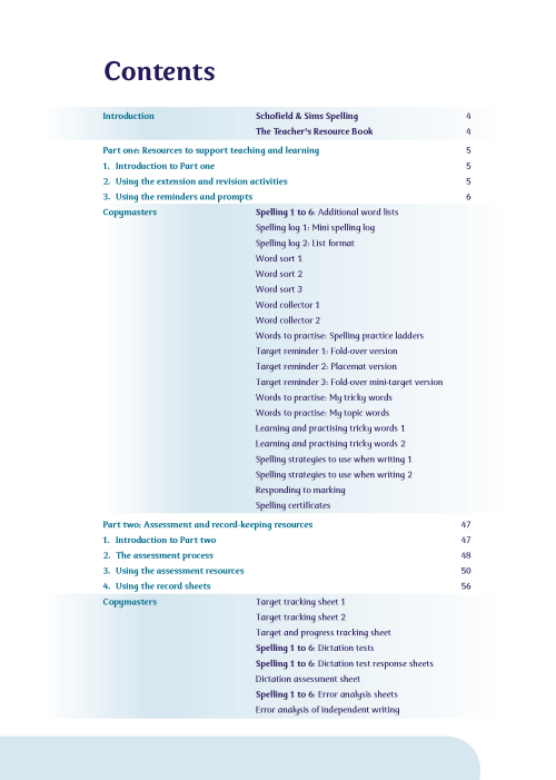 A separate accompanying teacher’s guide, Spelling Teacher’s Guide, (ISBN 9780721712185), provides detailed teaching notes that suggest how best to explain and explore each learning point and a selection of free downloads is also available from the Schofield & Sims website.